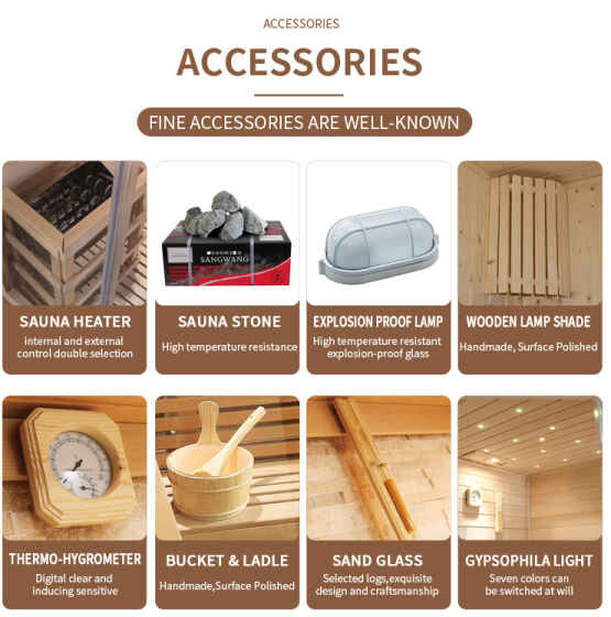 TheZewnętrzna łaźnia parowa ze szklanymi drzwiamijest wyposażony w 8 kategorii podstawowych akcesoriów, pokrywających potrzeby pełnego procesu sauny, pokazując jakość w szczegółach: