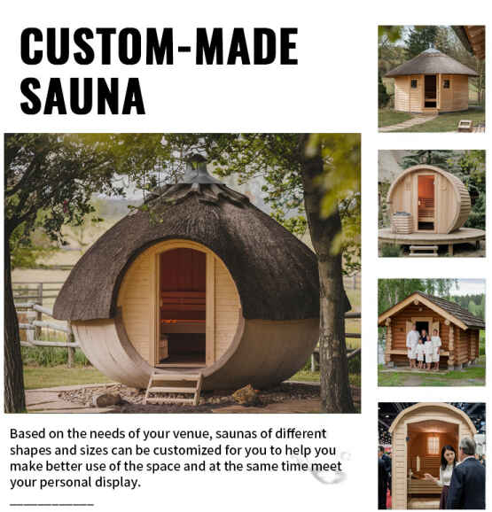 Dostosowanie kształtu: Koncentruje się na kształtach nadających się do użytku na zewnątrz, takich jak beczka, drewniany dom i kula, równoważąc wykorzystanie przestrzeni i naturalną estetykę. Niezależnie od tego, czy znajdujesz się w rogach dziedzińców, czy na kempingach,Zewnętrzna łaźnia parowa ze szklanymi drzwiamimoże harmonijnie integrować się ze środowiskiem zewnętrznym, takim jak zielone rośliny i skały.