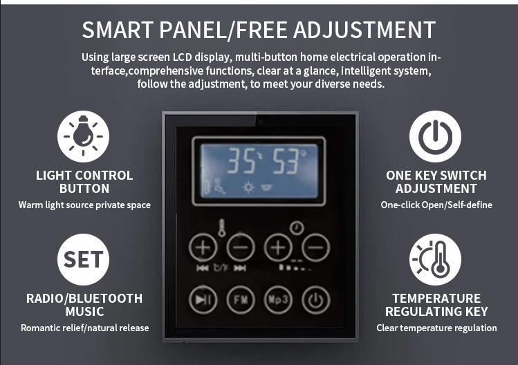 TheZewnętrzna łaźnia parowa ze szklanymi drzwiamijest wyposażony w wielkoformatowy, inteligentny panel sterowania LCD przeznaczony do zastosowań zewnętrznych (konstrukcja wodoodporna i pyłoszczelna), zapewniający wygodną obsługę „jednym klawiszem”: