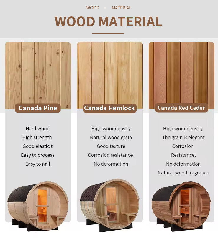 Personalizacja drewna: Wybiera wysokiej jakości importowane z Kanady drewno przeznaczone do zastosowań zewnętrznych – sosnę (wysoka twardość, opłacalna, zabezpieczona antykorozją), cykutę (o dużej gęstości, odporność na wilgoć i odkształcenia) oraz zachodni czerwony cedr (naturalnie antykorozyjny, z naturalnym zapachem drewna, dużą trwałością na zewnątrz), spełniający wymagania dotyczące odporności na warunki atmosferyczne w różnych środowiskach zewnętrznych dlaZewnętrzna łaźnia parowa ze szklanymi drzwiami.